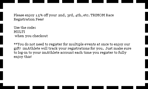 THERE ARE NO EXCEPTIONS! All participants must show a photo ID and their up-to-date USAT card (unless a one day membership is being purchased). Each packet will include your assigned bib number. Bib number must be worn during the run leg (via safety pins or a race belt).